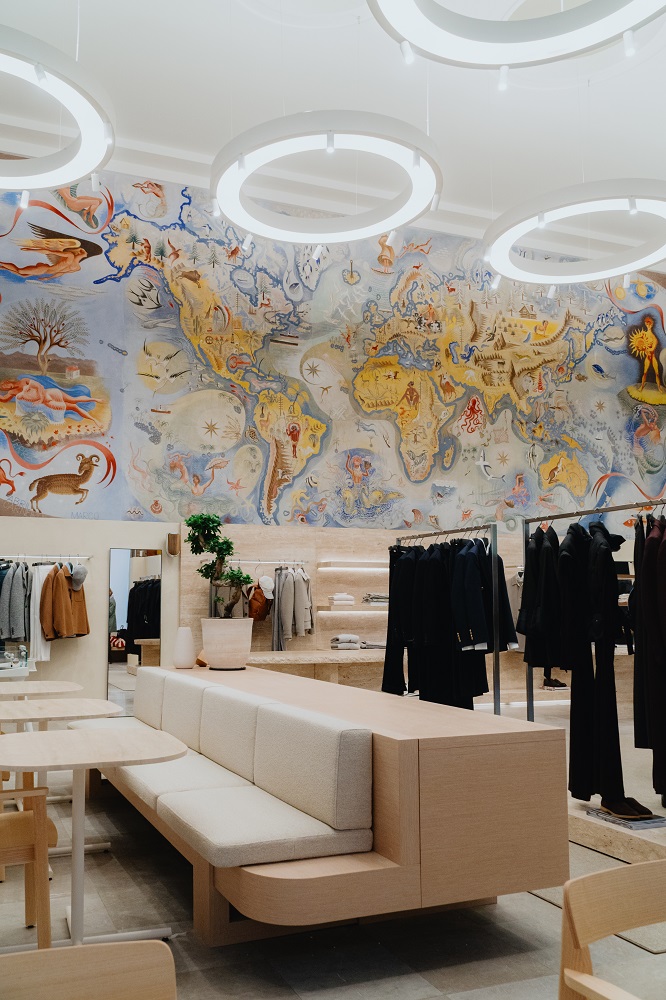 Com 260 m², a Eleventy Lisboa distribui-se em duas áreas distintas – a loja e o café-bar – projetadas como um percurso contínuo entre Moda, arte e gastronomia. O interior acolhe três frescos originais de Almada Negreiros, datados de 1939. A sua preservação e integração no projeto definem a identidade da nova flagship store da Eleventy Lisboa, que ambiciona transformar a experiência de compra numa imersão no universo da Eleventy.