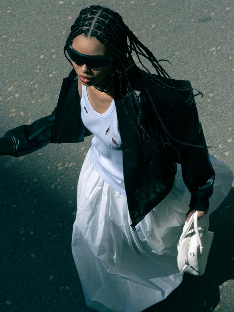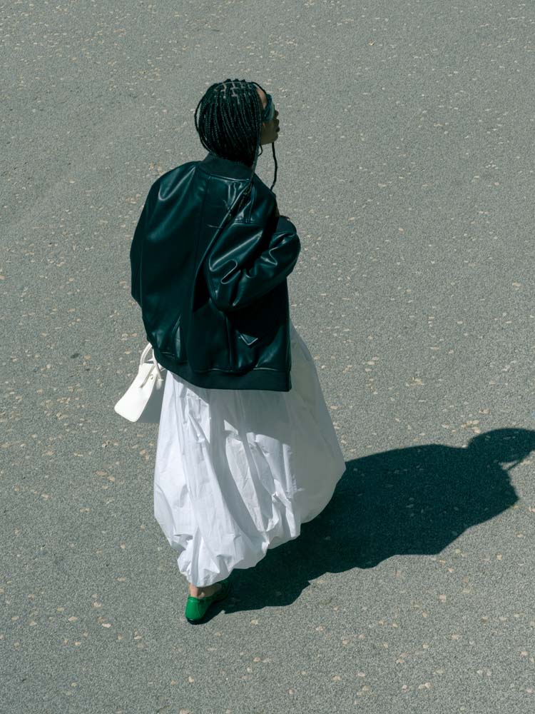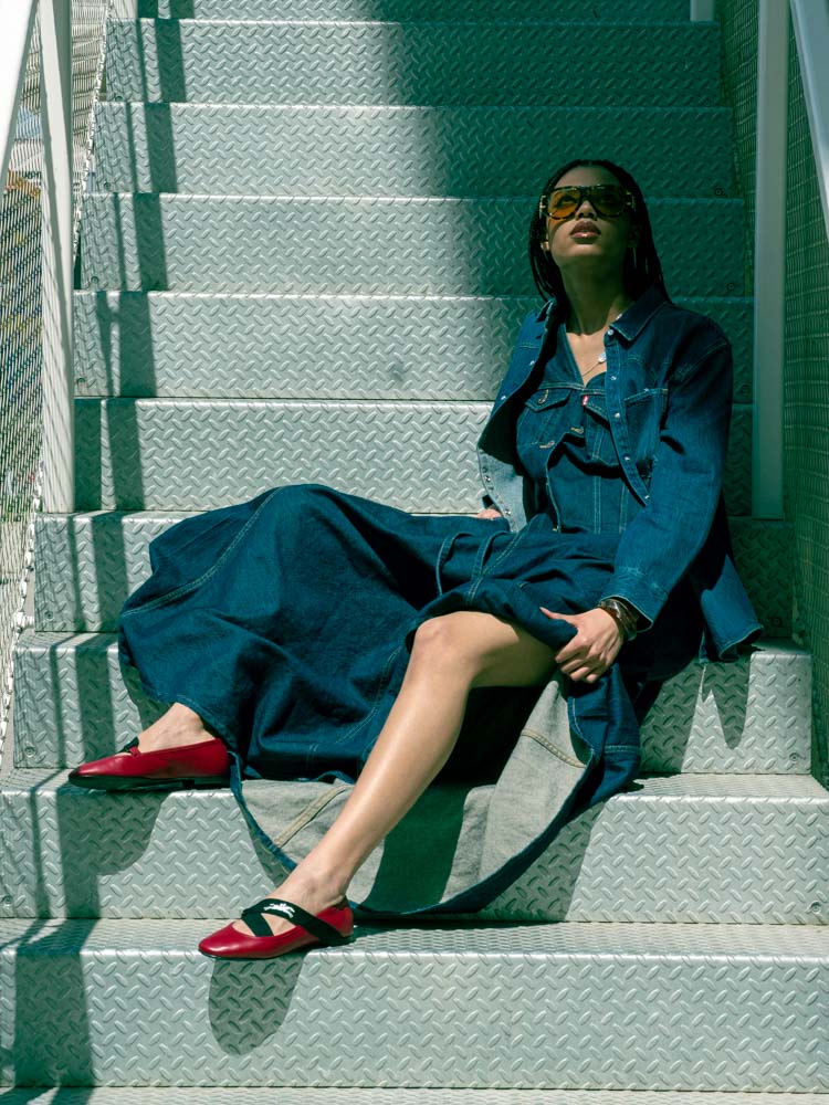 camisa e saia LEVIS, sabrinas LONGCHAMP, óculos de sol DOLCE&GABBANA
