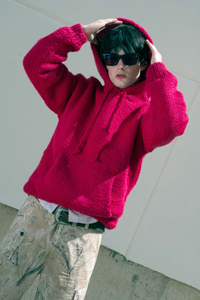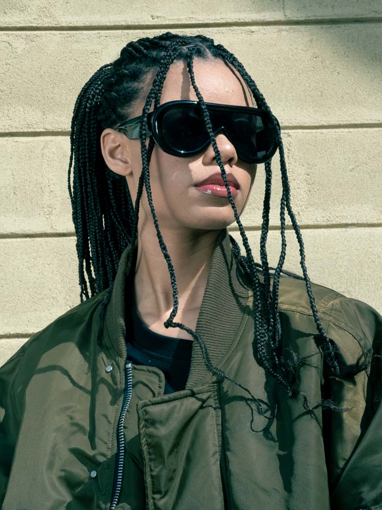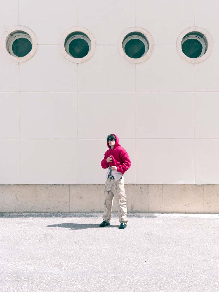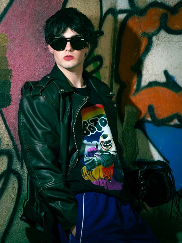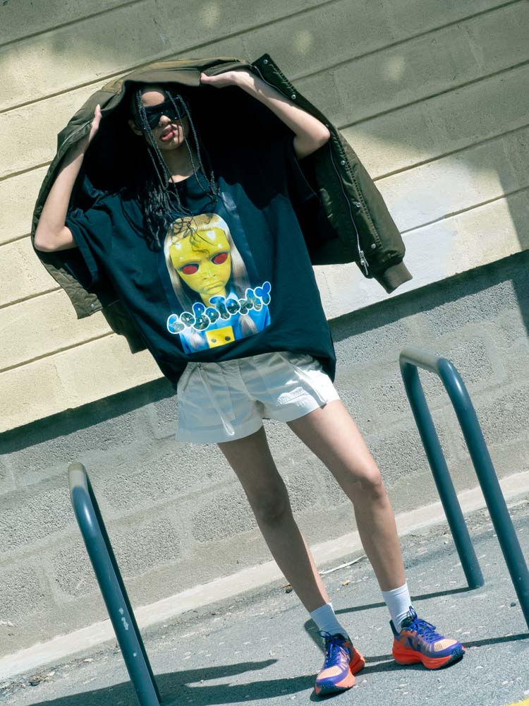 t-shirt DAVE and TONY, LOBCTOMY, calções PINKO, sneakers VEJA, óculos de sol PARFOIS, blusão da produção