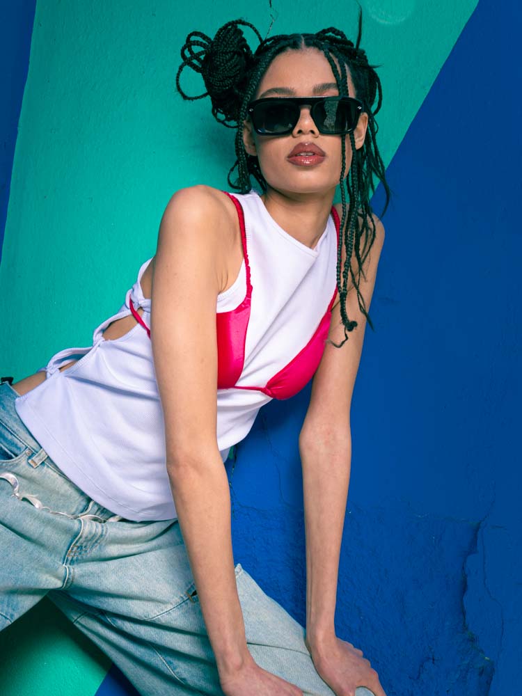 bikini TEZENNIS, sobre top GAELLE, jeans PINKO, óculos de sol …
