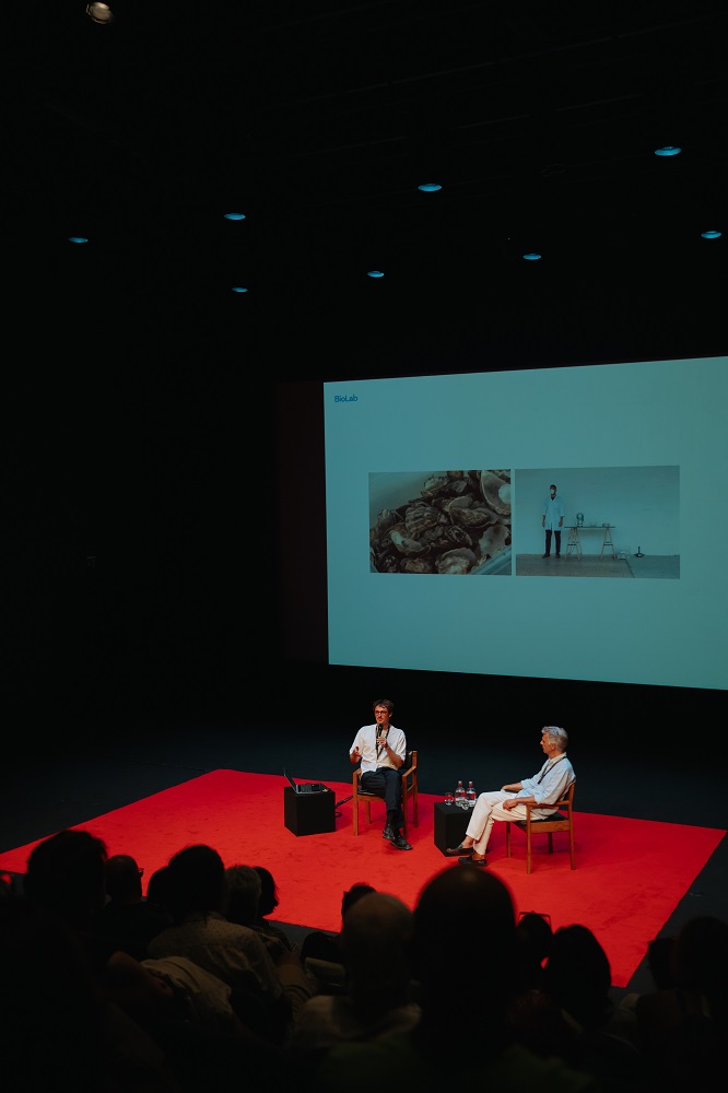 A primeira conversa, moderada pelo arquitecto Rafael Calado, coordenador do BioLab de Lisboa, contou com a presença dos arquitectos suíços Jeremy Morris e Luca Carlisle (colectivo Fahrenheit 180º)2, e consistiu na apresentação do projecto ecológico “À Flor do Azulejo, a Cor do Tejo“, inspirado nos azulejos tradicionais portugueses. O projecto, integrado num outro, mais amplo, “Bauhaus of the Sea Sails”, este focado no diálogo entre a atividade humana urbana e os mares e oceanos, propõe, mais do que uma resposta estética, uma miríade de soluções sustentáveis: o desenvolvimento de biomateriais, oriundos da recolha de resíduos naturais marinhos, como algas (alginato), e conchas de bivalves (ostras portuguesas).