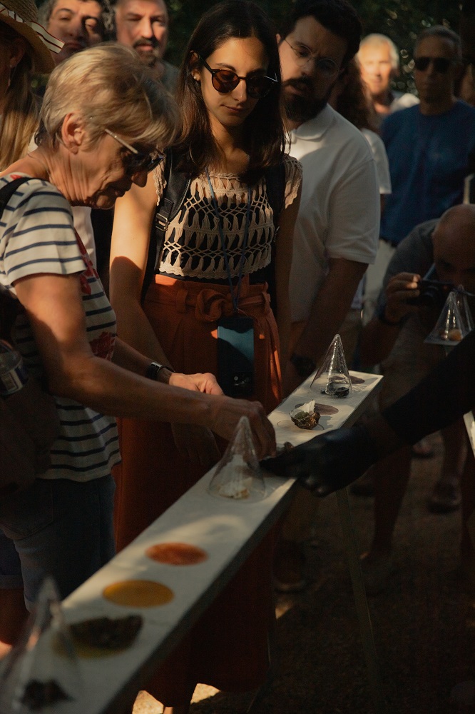 No seguimento das conversas, os presentes foram convidados a assistir a vários eventos artísticos no Jardim da Gulbenkian. Teve lugar uma degustação memorável, do projecto gastrónomico “Boca do Estuário”, concebido pela Chef e bióloga Joana Duarte. O projecto teve a colaboração da Mesa do CAM, e consistiu num menú regenerativo que, de uma forma consciente e criativa, uniu histórias e sabores dos territórios de Marvila e Oeiras. Houve também a oportunidade de provar várias iguarias, salgadas e doces, com ingredientes biológicos, como cereais resistentes à seca (sorgo e chícharo), peixes invasores (corvinata), ostras, e algas oriundas da costa portuguesa.